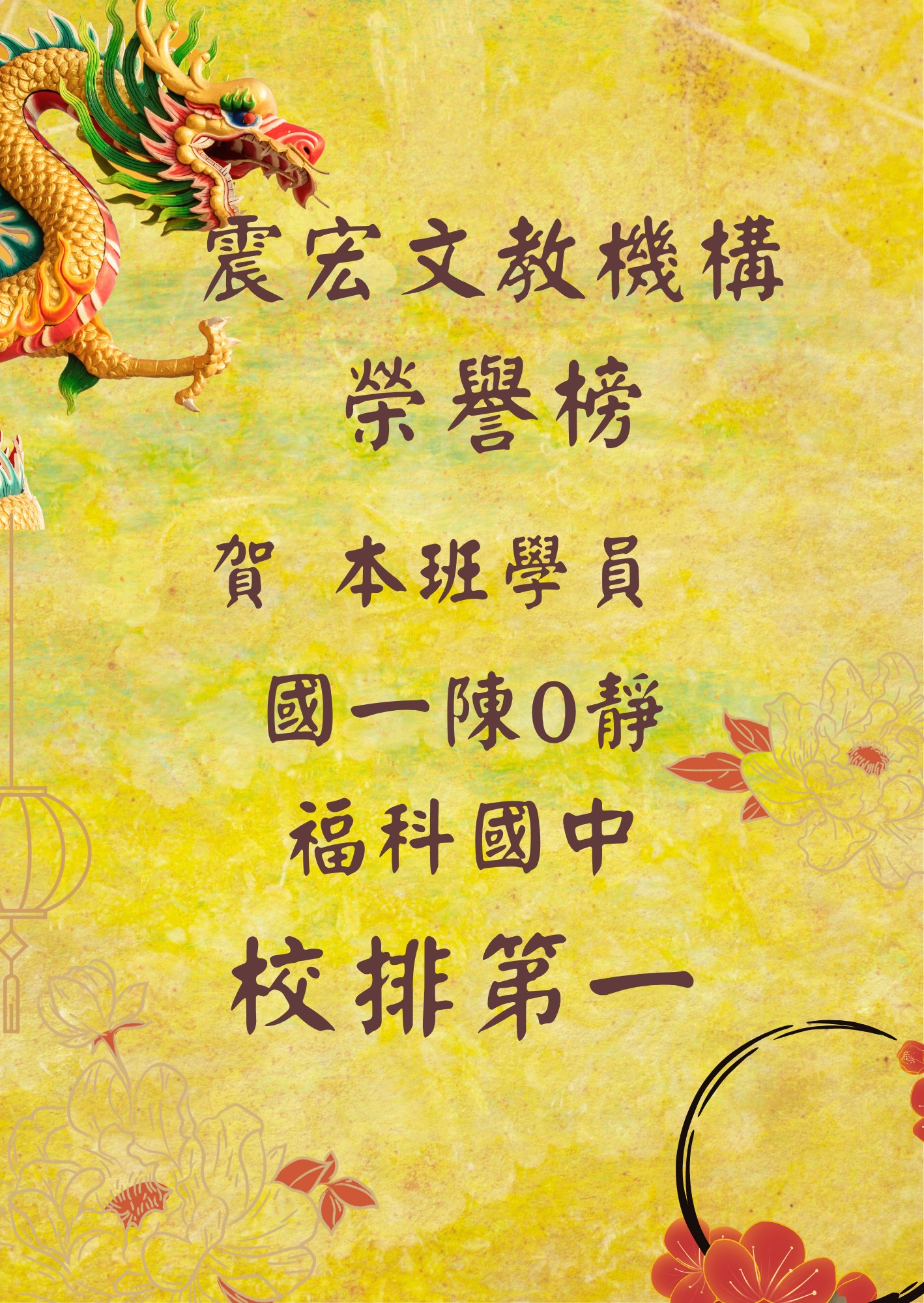 最新消息~~震宏文教機構榮譽榜賀 本班學員國一陳0靜福科國中🎉校排第一🎉西屯小學部 中市福泰街102號 04-24625295西屯國高中部 中市福科路340巷17號 04-24625296北屯旗艦校 中市瀋陽路二段150號 04-22416768