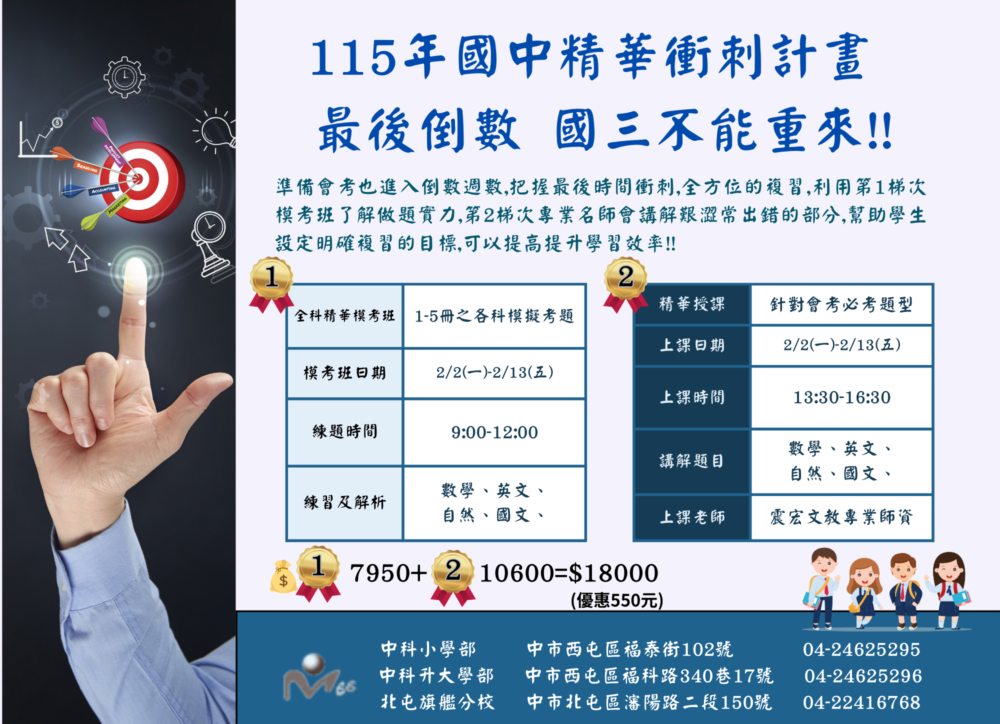 最用心的陪伴!!最精湛的會考精華試題與課程!讓您們掌握會考應試方向及精華重點筆記!!英-數-自-國 4科及寒假密集衝刺計畫邁向5A實力人生!人生中需努力的起跑點⋯各位同學要加油!!老師ㄧ定陪在你們身旁!!