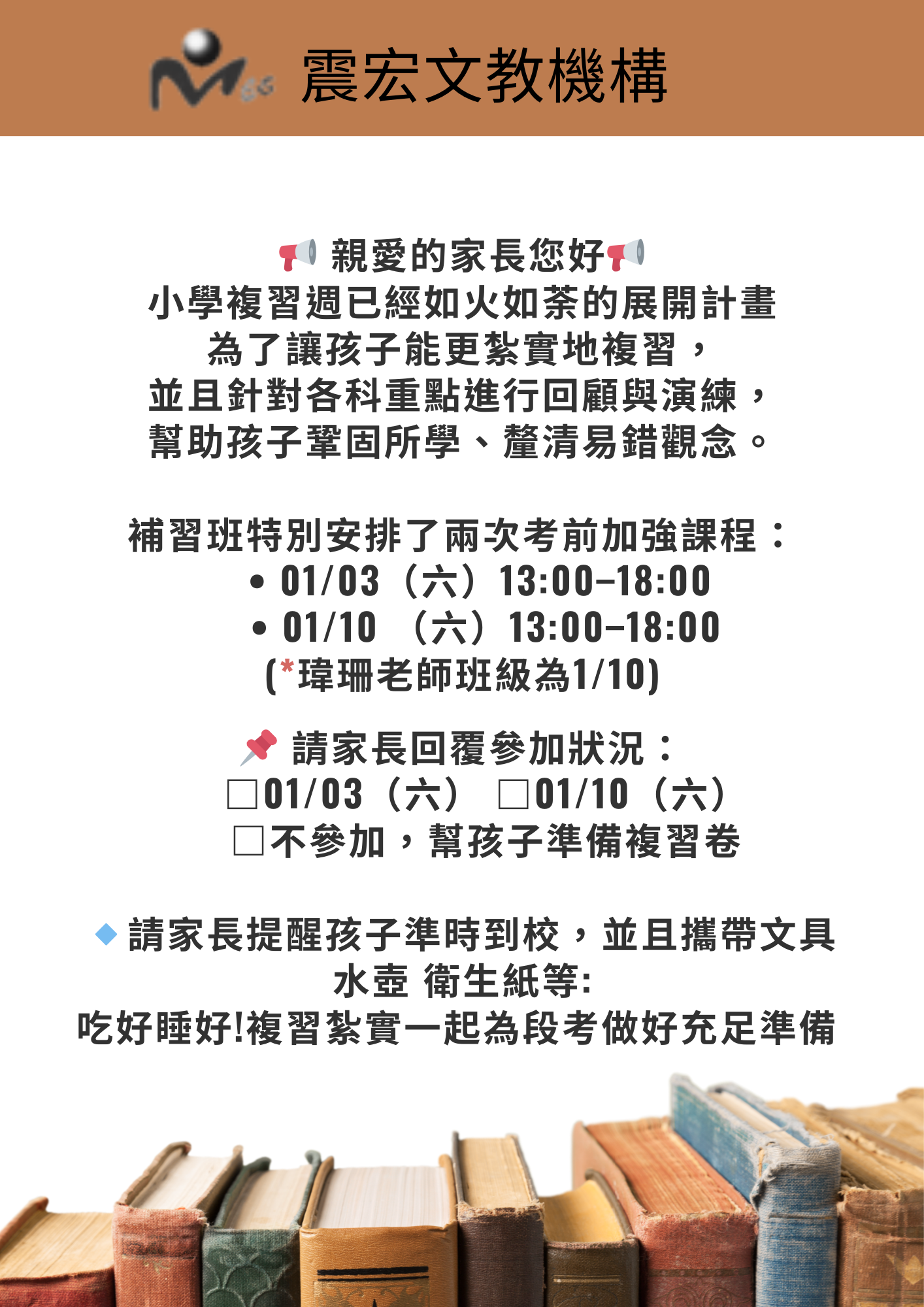不參加,請幫孩子準備複習卷帶回